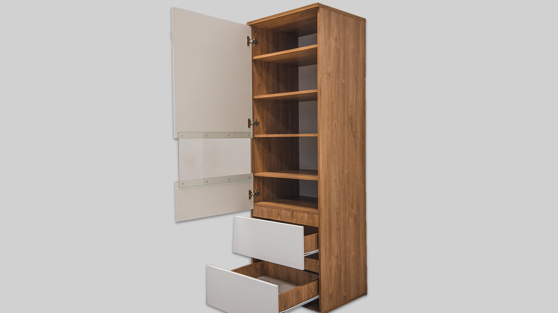 Proizvod je napravljen od visoko kvalitetne iverice 16mm, obložena melaminskom folijom, HDF 3mm, kvalitetni metalni okovi.